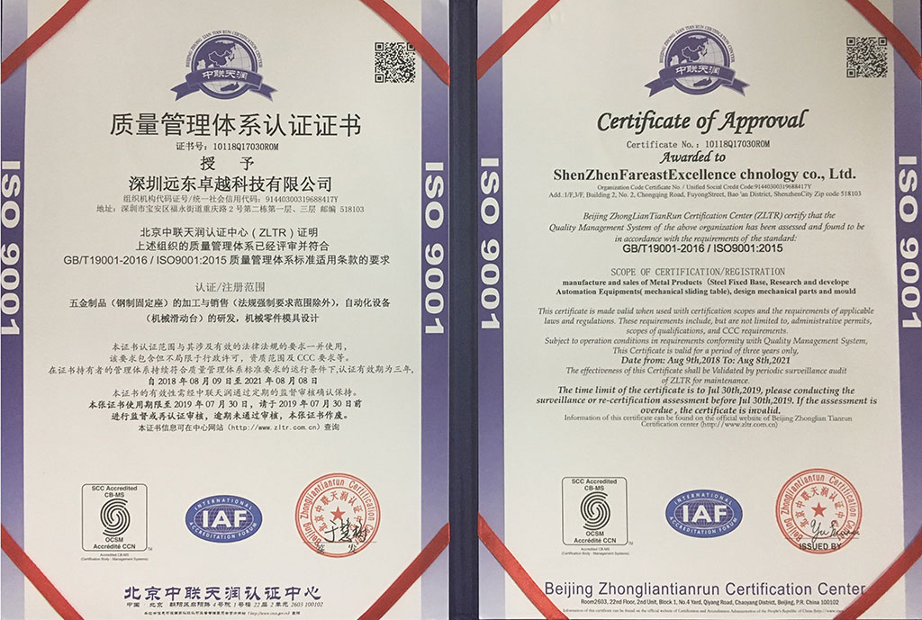 Nel 2015, abbiamo ottenuto la certificazione del sistema di qualità ISO9001 e accelerato il ritmo di sviluppo delle informazioni. Al fine di migliorare la competitività di base dell'azienda, l'azienda ha rafforzato la gestione della qualità, ha migliorato l'efficienza dell'impresa, ha migliorato efficacemente il metodo di controllo della qualità del processo, ha migliorato l'effetto preventivo del punto di controllo della qualità e ha svolto un ruolo attivo nel miglioramento del controllo della qualità del processo e garanzia della qualità dei prodotti. Otterremo ISO 1400, ISO 13485 e IATF 16949 a marzo 2022.